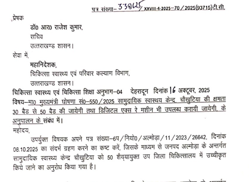 सूबे के चिकित्सा स्वास्थ्य एवं चिकित्सा शिक्षा मंत्री डॉ. धन सिंह रावत ने बताया कि प्रदेश में चिकित्सा सेवाओं के विस्तार व आम लोगों को बेहतर उपचार सुनिश्चित करने के लिये राज्य सरकार लगातार प्रयासरत है। सरकार ने जन अपेक्षाओं के अनुरूप अल्मोड़ा जनपद के चौखुटिया और आसपास के ग्रामीण क्षेत्रों में उच्च स्तरीय चिकित्सा सुविधाएं उपलब्ध कराने के दृष्टिगत 30 शैय्यायुक्त सामुदायिक स्वास्थ्य केन्द्र चौखुटिया को 50 शैय्यायुक्त उप जिला चिकित्सालय में उच्चीकृत कर दिया है। जिसका शासनदेश जारी कर विभागीय अधिकारियों को अस्तपाल के विस्तार की प्रक्रिया शीघ्र पूरा करने के निर्देश दिये हैं।