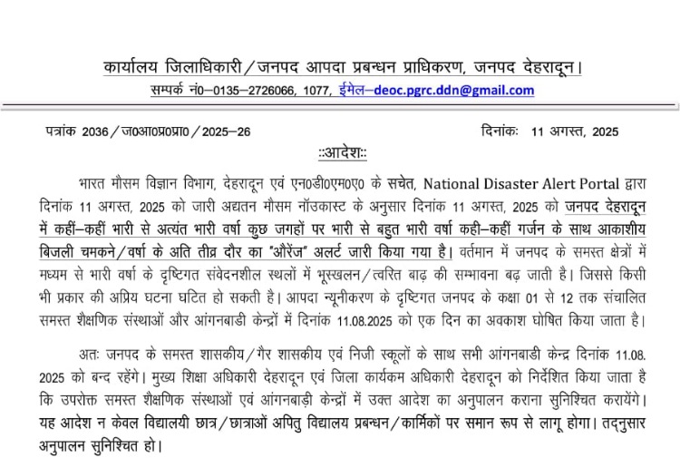देहरादून में भारी बारिश का ऑरेंज अलर्ट, आज सभी स्कूल और आंगनबाड़ी केंद्र बंद