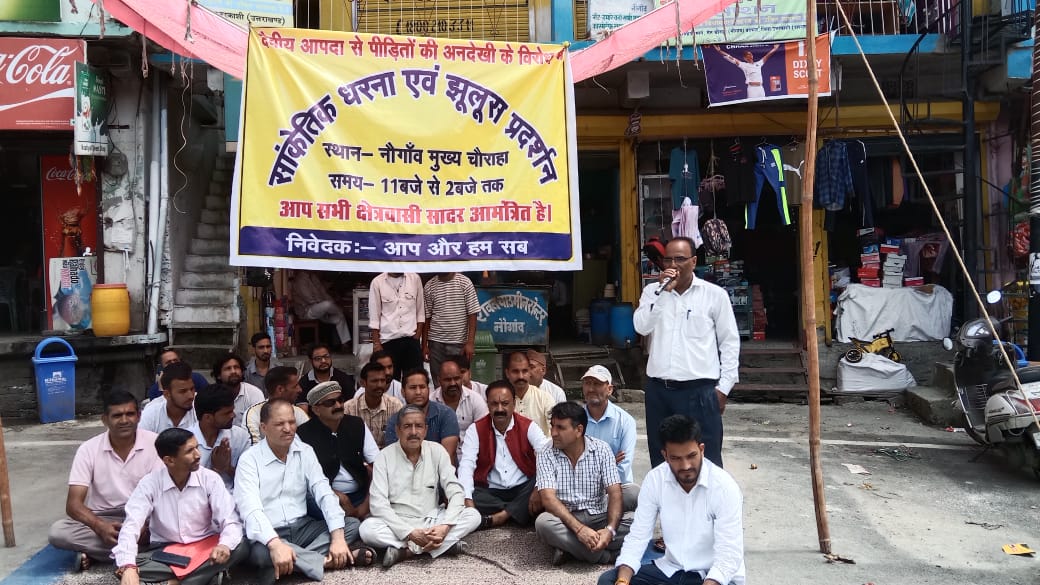 उत्तरकाशी/नौगांव। पुरोला विधानसभा के अंतर्गत नगर पंचायत नौगांव में बिते दिनों आई दैविक आपदा से प्रभावित हुये लोगों ने सरकार और प्रशासन और स्थानीय विधायक दुर्गेश्वर लाल पर अनदेखी का आरोप लगाया और प्रशासन और विधायक के खिलाफ नारेबाजी कर एक दिवसीय धरना प्रदर्शन नौगांव चौराहे पर किया।