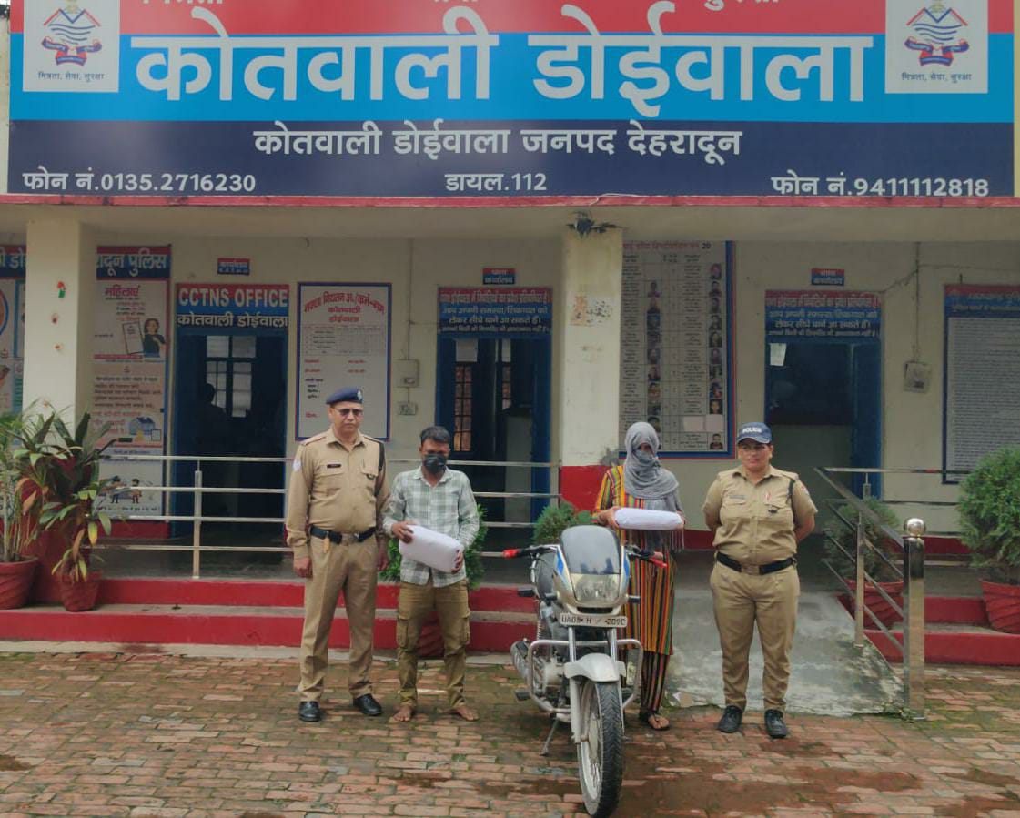 सोमवार देर रात पुलिस ने कुआँवला हर्रावाला के पास सघन चैकिंग अभियान चलाया। चैकिंग के दौरान वाहन से 4 किलो 60 ग्राम गांजा बरामद किया। वाहन में सवार मोहम्मद जावेद पुत्र मोहम्मद मुश्ताद निवासी बरड़ बिहार, तथा पुष्पा पत्नी दिनेश डोईवाला क़ो गिरफ्तार कर वाहन की सीज कर विभिन्न धाराओं व एनडीपीएस की धारा में मुकदमा दर्ज कर न्यायालय में पेश कर जेल भेज दिया है। पुलिस टीम में उपनिरीक्षक रघुवीर कपरवाण, देवेंद्र नेगी, विकास रावत,रविन्द्र टम्टा, दिनेश रावत, बबिता रावत आदि थे।