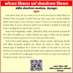 देहरादून। उत्तराखंड राज्य स्थापना के रजत जयंती सप्ताह के अवसर पर युवाओं के लिए आज एक बड़ा मौका मिलने जा रहा है। कौशल विकास एवं सेवायोजन विभाग की ओर से ‘कौशल एवं रोजगार महोत्सव-2025’ के तहत आज यानी 6 नवंबर को आईटीआई निरंजनपुर में बृहद रोजगार मेले का आयोजन किया जा रहा है।