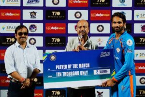 कुणाल चंदेला को उनकी ताबड़तोड़ पारी के लिए प्लेयर ऑफ द मैच चुना गया।